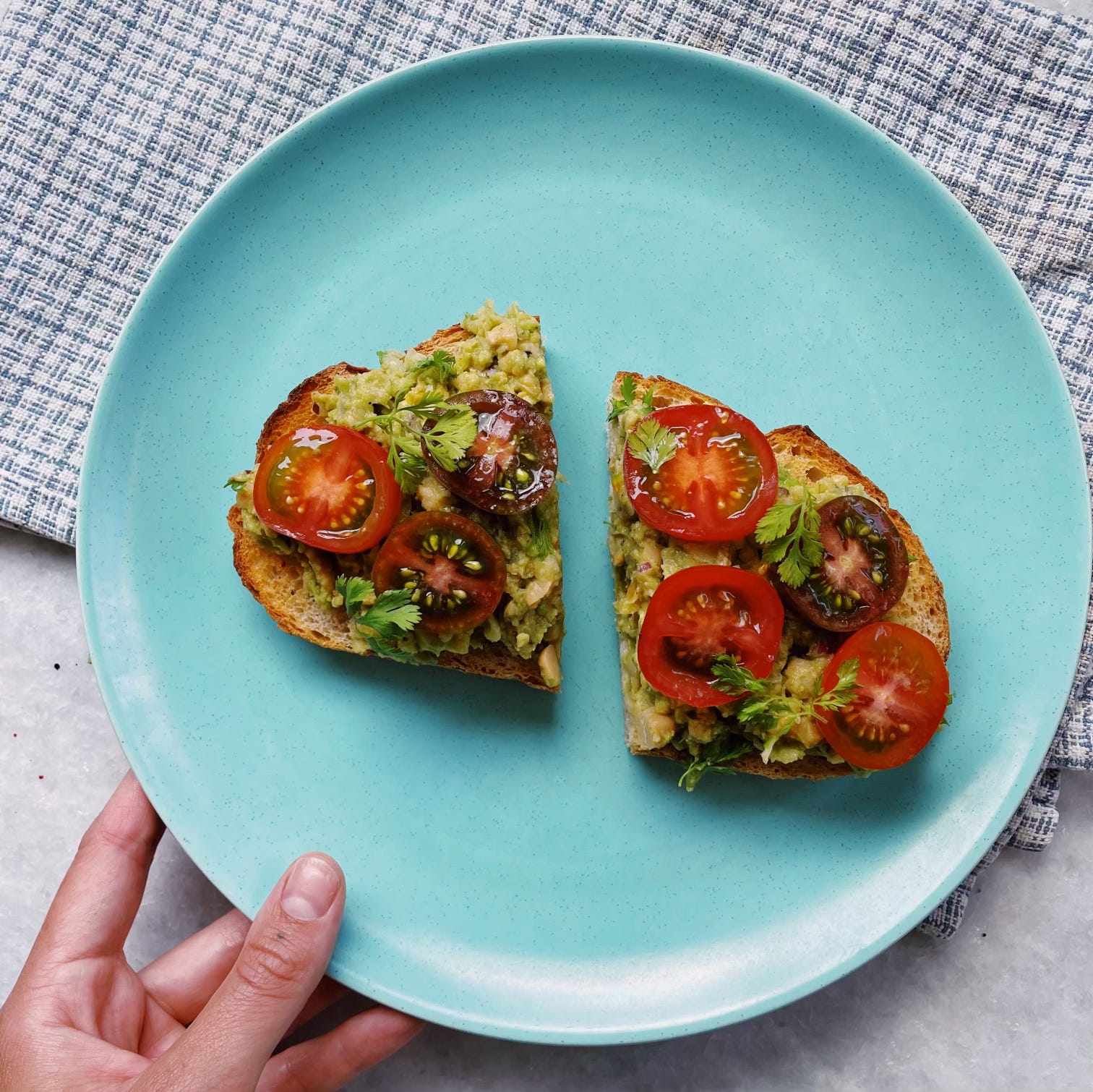 Mash the avocado and chickpeas together in a bowl with a fork and stir in the rest! I served on toast with a little mayo and topped with slices of tomato, a little flaky sea salt and more cilantro as garnish but you could also make it as a sandwich with butter lettuce, arugula or sprouts. Ingredients can be prepped in advance. Leave out avocado if you’re food prepping so it doesn't turn a gross brown color. Either way, it comes together pretty quick for an easy weekday lunch!